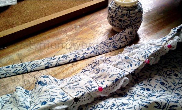 The bias tape is made by following instructions on the book : ” Bend the Rules Sewing “. There are similar tutorials online. What I like about this method is you just need a small piece of square/rectangular fabric to make a long roll of bias tape. If you don’t have a fancy bias tape maker-gizmo, this tutorial will be a gem. You can make any width with just a sewing pin as a guide.