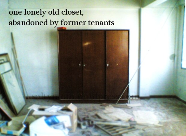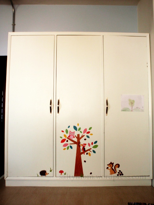 Spooky, dingy closet with a new coat of paint, a change of handles, and some vinyl stickers, becomes a spanky new kids’ closet.