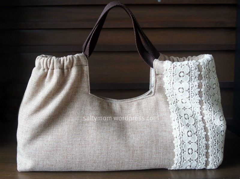 The materials composition. Both of the fabric are rather thin, so felt was used as interfacing to give it some body. The pattern is U-shaped , with the outside fabric a bit longer since the top portion will have to roll back into the bag to hold the handles in place. You’ll also need to add a sturdy bag bottom for the bag to keep its rectangular shape.