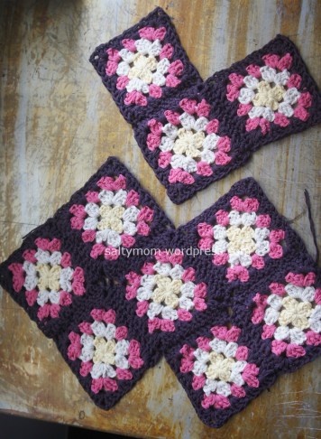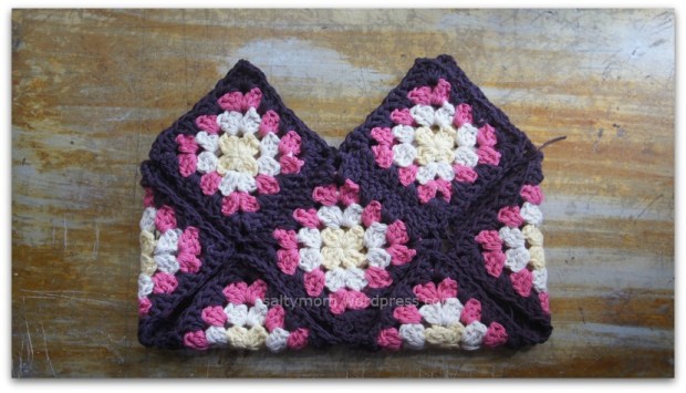 Then, place the smaller piece on top , fold up the remaining pieces and single crochet to join. I’m doing a row of double crochet around the bag’s opening.