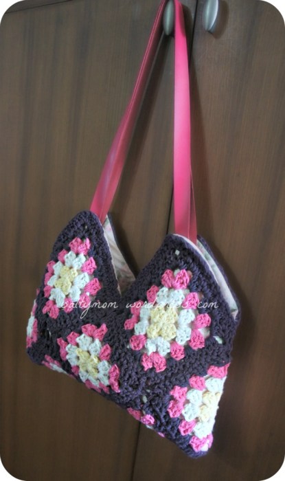The granny squares bag has been completed for some time. However, concentration to write a post was almost nil with the husband watching episodes after episodes of “Spartacus” . All those face hacking, limbs a-flying, geyser-like blood gushing created much distraction when one is trying to write about a granny squares bag.