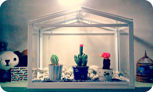 I couldn’t find the website where the blogger used this greenhouse to store a variety of tea and snacks. It would look very cute too on top of a dinner table. I’m not sure if the lightning is sufficient for the cactus. If things doesn’t work out, they’ll  be moved to the balcony and I’ll store toilet rolls inside instead. It would still look lovely 🙂
