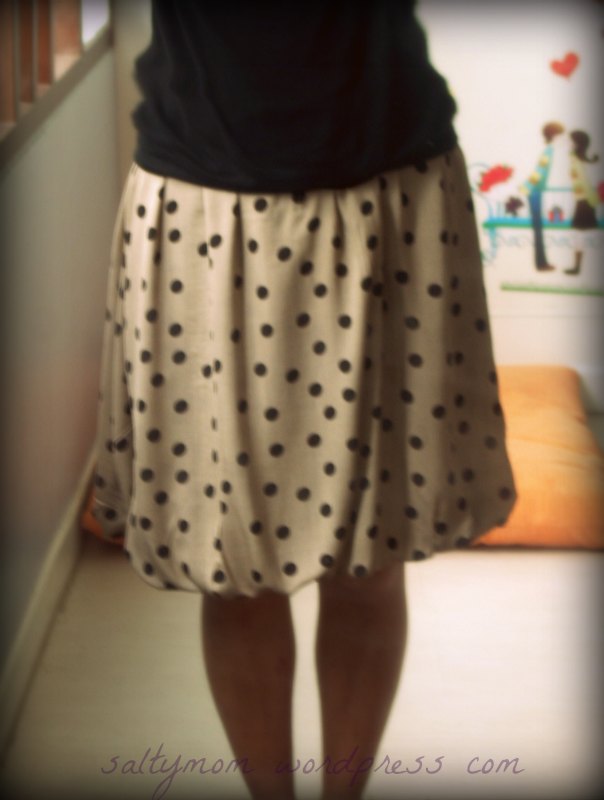 Loongg time no post ( again ). Recently I bought some discounted polka dots fabric and when I got home I realized that the polka dot patterns were off. I decided to make something with a lot of gathers so the wonky dot patterns won’t show that much , hence I picked a bubble skirt pattern.