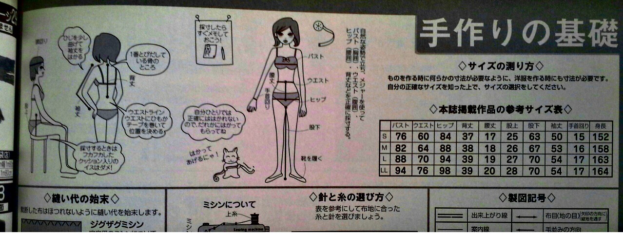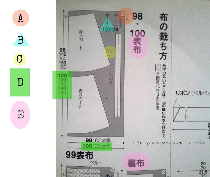 Then you play match the characters on the illustration to the chart. The first 3 are the bust-waist-hip sizes. Since I’m making a skirt, I find the size where my waist will fit… which is size LL … WTF !!?? *cry*