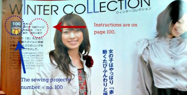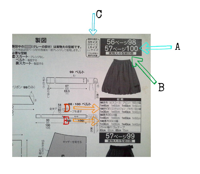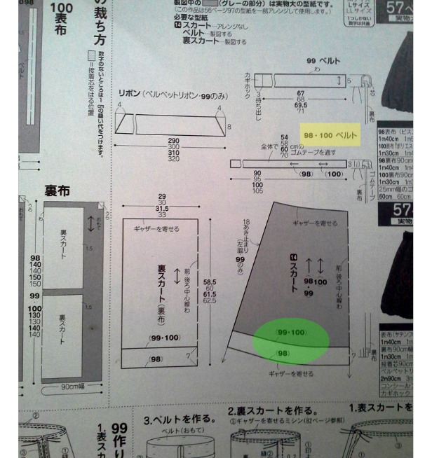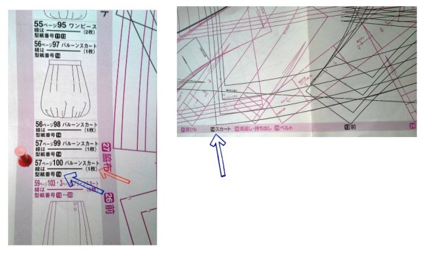 First we’ll start with section 1. Since the same pattern can be altered to make different versions, you’ll have to locate the sewing pattern number that you want to make. In my case, it is #100 ( marked “A” below). The “57” there means page 57 where the original photo of the skirt is.