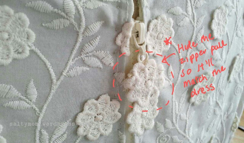 I ran out of invisible zippers and sew a bag zipper with contrasting color on it, exposed style. I thought it was going to be real fashionable but it turned out really ugly. I spent half the night picking out the whole thing ! Since I was going to wear it the next day, I hand sew on a jacket zipper that matches the dress’ color. The zipper pull was star-shaped so I covered it up with flower trims. When I re-do the zippers, I will cover it up the same way. I think it’s cute !
