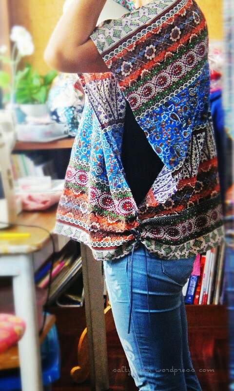 I needed some distraction from sorting all the stuffs in the storage room and made a poncho. I’ve seen some made from scarfs and it seems like a quick and easy pattern-less project. This is also good for using up those left-over “L” shaped fabrics after you’ve made a top.