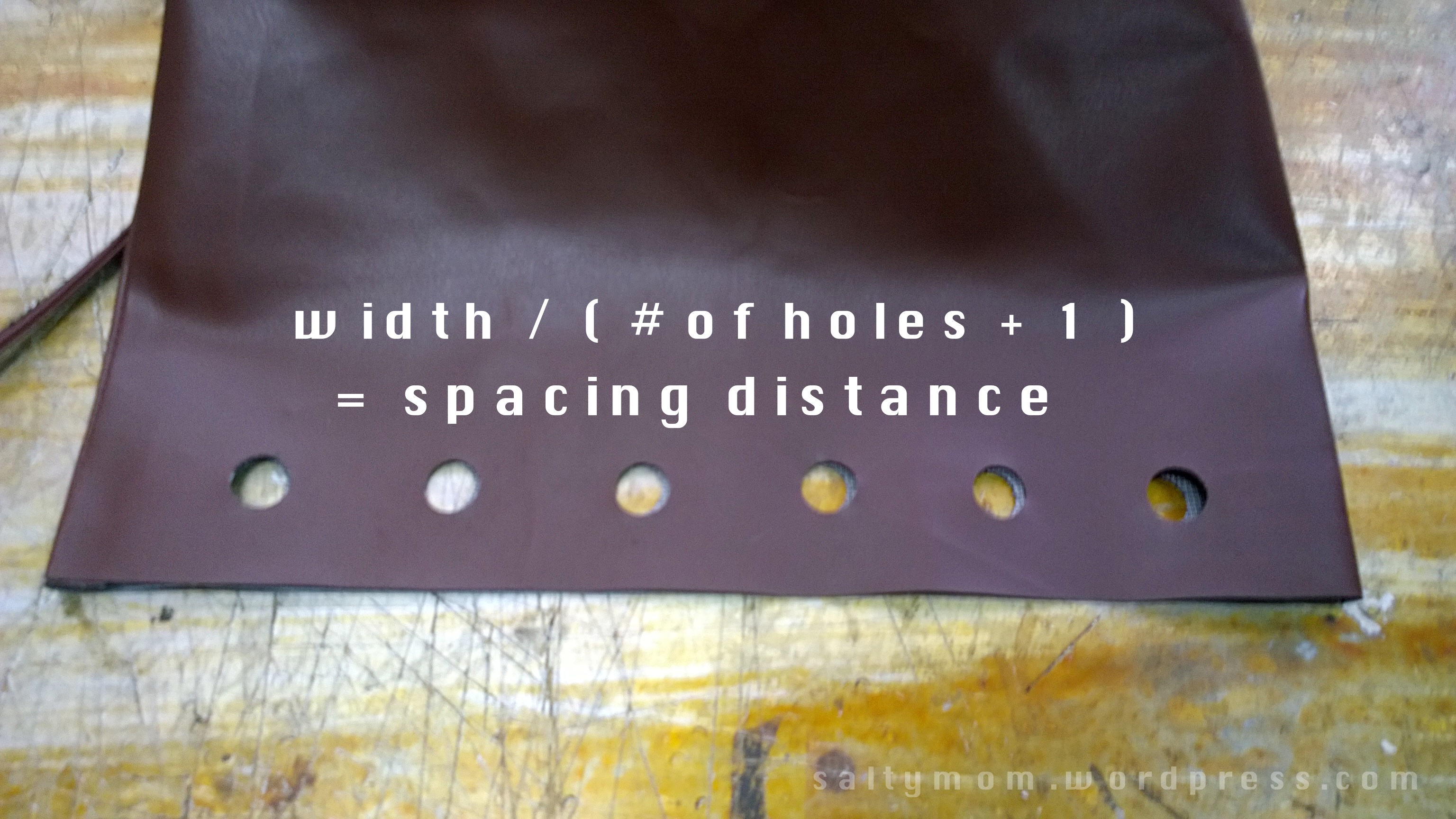 For the bag’s opening, you need to knock 6 holes on each side. To find the distance between the holes, measure the bag’s opening on one side, divide it by the number of spaces between the holes ( that will be 7 ).
