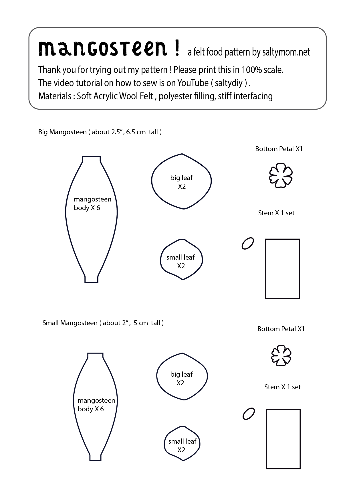 I also made a pattern for 2 sizes of mangosteen ( about 2.5″, 6.5 cm / 2″, 5 cm height )