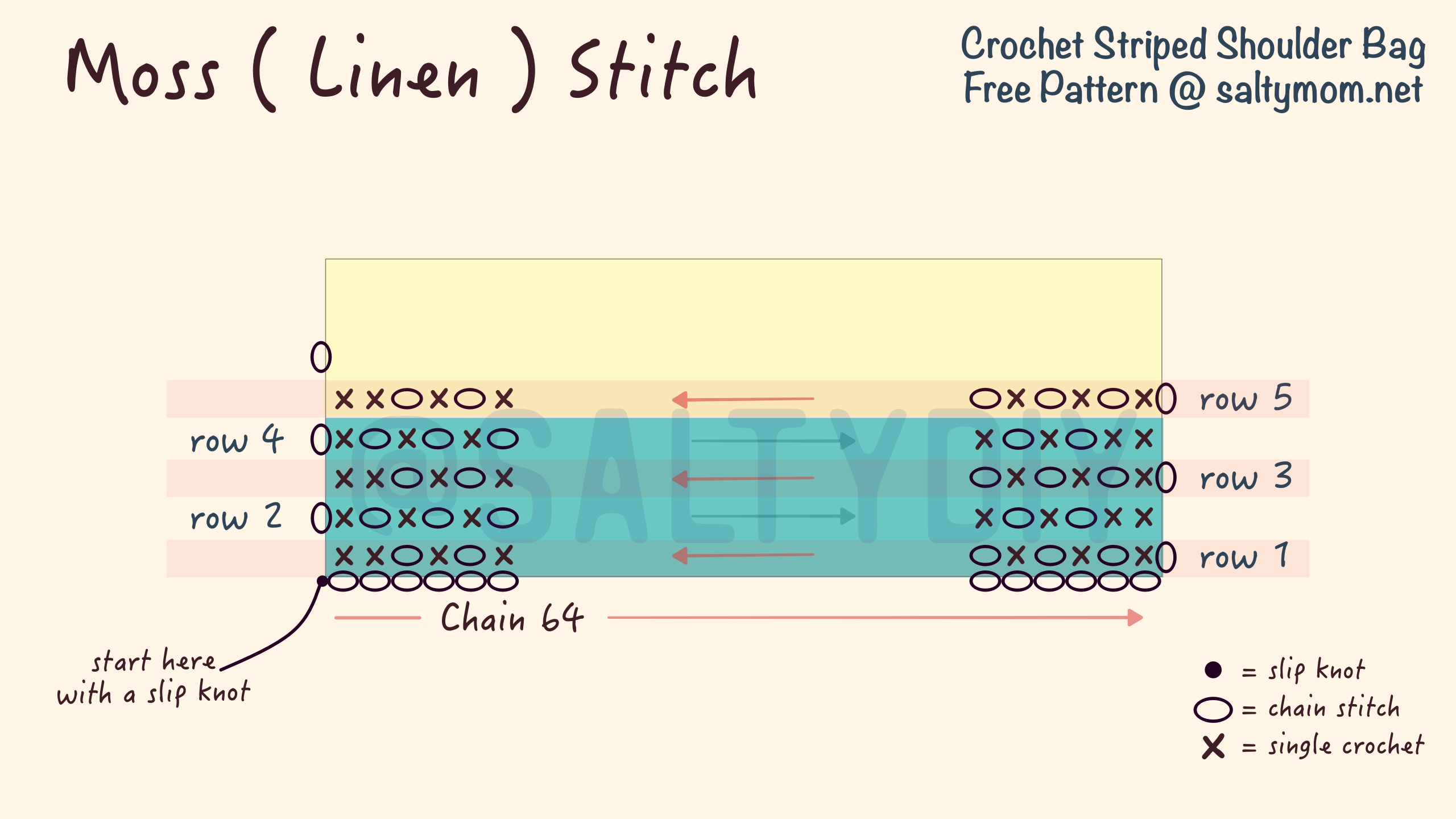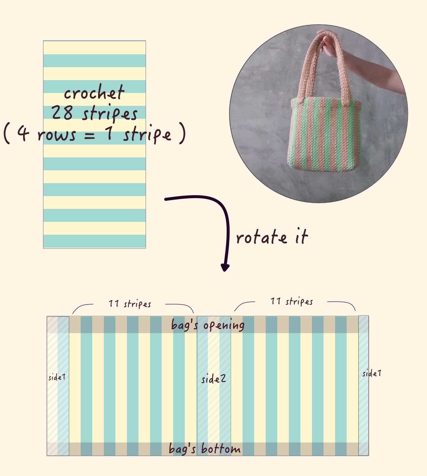 The bag pattern is a large rectangle. The number of stripes will determine the width of the bag. If you want a wider bag, just add more stripes, in even numbers. If it’s odd number, when we connect the sides, the stripes will be in the same color and it breaks the pattern.